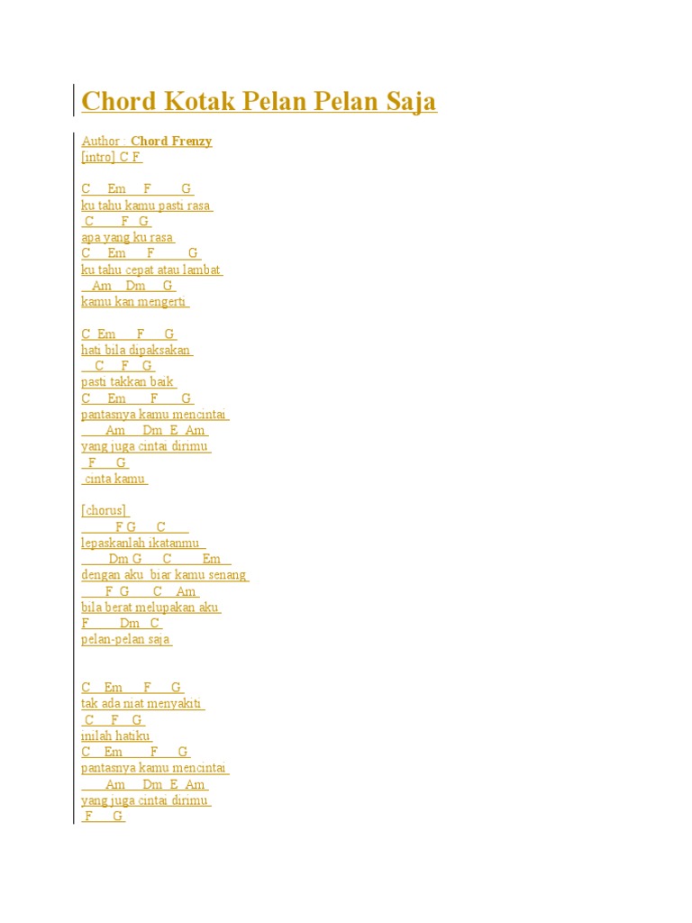 Am Dm Am Am Dm perjalan panjang yang telah kulalui Am ku coba merangkai mimpi yang terhenti Am Dm cobaan yang datang selalu menghantui Am F kuatkan jiwa ku tuk tetap berdiri G F. Lagu tersebut dirilis lewat album Hujan yang dirilis pada 2010 Lonely Soldier Boy. Chord Gitar Lagu Kotak - Pelan Pelan Saja.